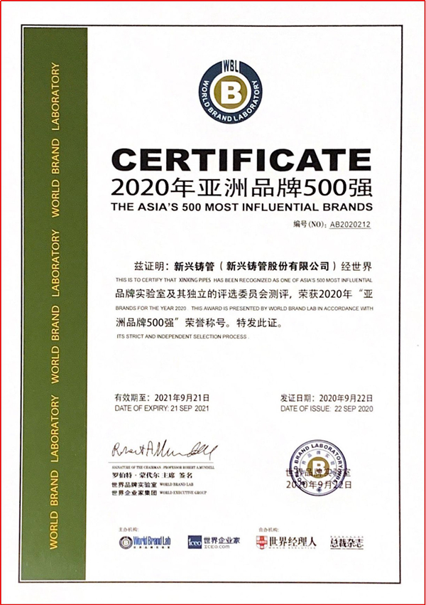 由世界品牌實驗室(World Brand Lab)主辦的“亞洲品牌大會”2020年9月22日在上海召開。該機構揭曉了由其獨家編制和發布的2020年《亞洲品牌500強》排行榜。“新興”品牌第六次被授予“2020年亞洲品牌500強”榮譽稱號,今年公司位列第212位,較去年提升16個名次,品牌影響力穩步提升。